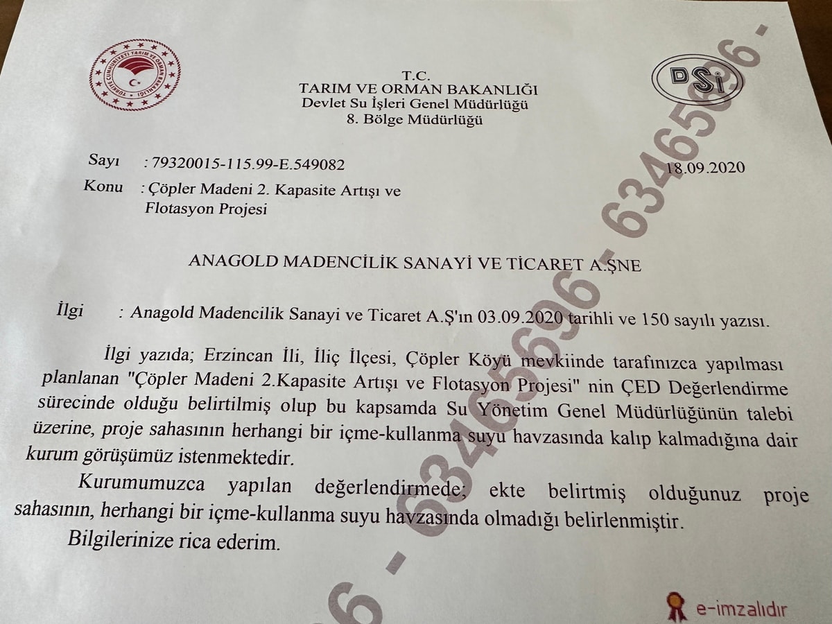 * “Erzincan ili İliç ilçesi Çöper köyü mevkisinde yürütülmekte bulunan altın madenciliği projesinin ikinci kapasite artırımına dair hazırlanan ÇED raporuna sunulan DSİ Genel Müdürlüğü 8’inci Bölge Müdürlüğü görüşünde, ilgili yazıda, ‘Erzincan ili Çöpler Köyü mevkisinde tarafınızca yapılması planlanan Çöpler Madeni, ikinci kapasite artışı ve lokasyon projesinin ÇED değerlendirme sürecinde olduğu belirtilmiş olup, bu kapsamda Su Yönetim Genel Müdürlüğü’nün talebi üzerine proje sahasının herhangi bir içme ve kullanma su havzasına kalıp kalmadığına görüşümüz istenmektedir.