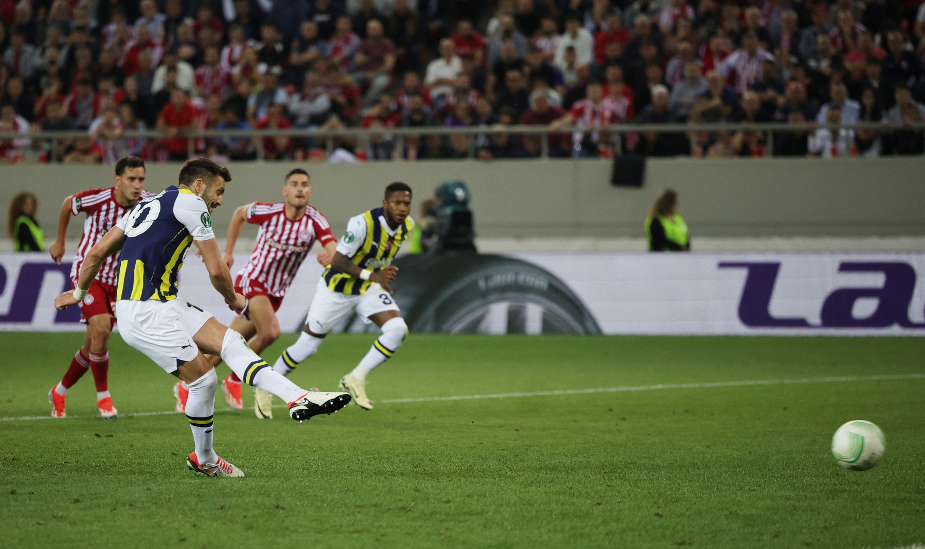 Fenerbahçe, UEFA Avrupa Konferans Ligi Çeyrek Final ilk maçında Olympiacos’a konuk oldu. Georgios Karaiskakis Stadı’nda oynanan karşılaşmanın ilk yarısını ev sahibi ekip, 8’inci dakikada Kostas Fortounis ve 32’nci dakikada Stevan Jovetic’in golleriyle 2-0 önde tamamladı. 57’nci dakikada Chiquinho’nun golüyle farkı 3’e çıkaran Yunan ekibine Fenerbahçe, 68’inci dakikada penaltıdan Dusan Tadic ve 74’üncü dakikada İrfan Can Kahveci’nin attığı gollerle cevap verdi.