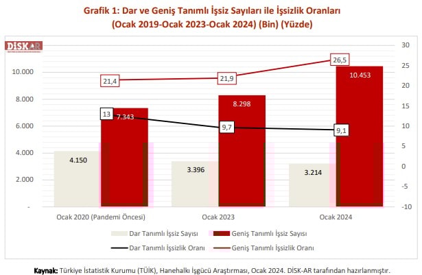 TÜİK’e göre pandemi öncesinde, 2020 Ocak’ta yüzde 13 olan dar tanımlı işsizlik Ocak 2024’te yüzde 9,1 oldu ancak aynı dönemde geniş tanımlı işsizlik yüzde 21,4’ten yüzde 26,5’e yükseldi.