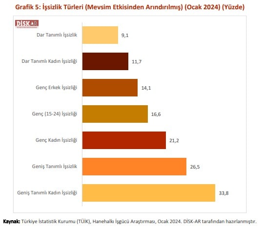 Ocakta mevsim etkisinden arındırılmış dar tanımlı işsizlik oranının yüzde 9,1, mevsim etkisinden arındırılmış geniş tanımlı işsizlik oranının (âtıl işgücü) ise yüzde 26,5 seviyesine yükseldiği hatılatılan raporda, geniş tanımlı işsiz sayısının bu dönemde 10 milyon 453 binle pandemi dönemi hariç tüm zamanların zirvesine yükseldiği belirtildi.