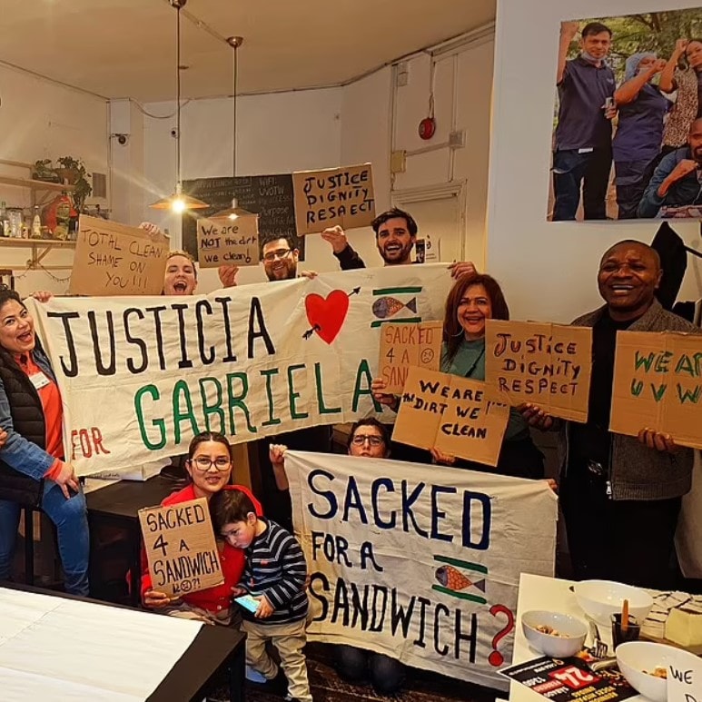 Rodriguez’in meslektaşları, üst düzey avukatların yılda 1,68 milyon pound kazandığı Londra’nın merkezindeki Devonshires Genel Merkezi’nin önünde gösteri yaptılar; konserve ton balığı ve üzerinde “Bir sandviç için mi kovuldunuz?” yazan pankartlar taşıdılar.